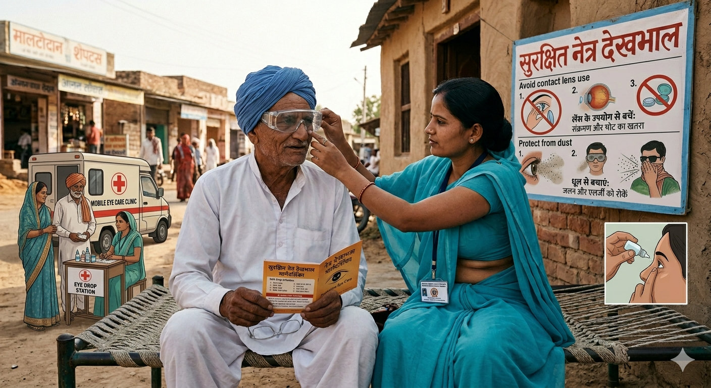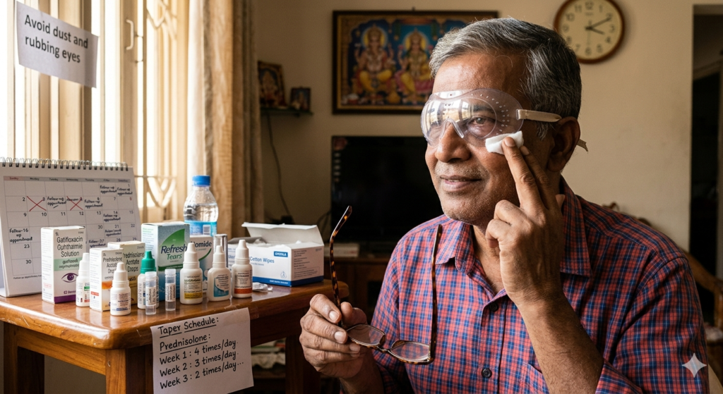 Avoid contact lens use and protect from dust or injury.