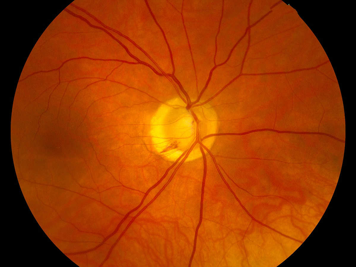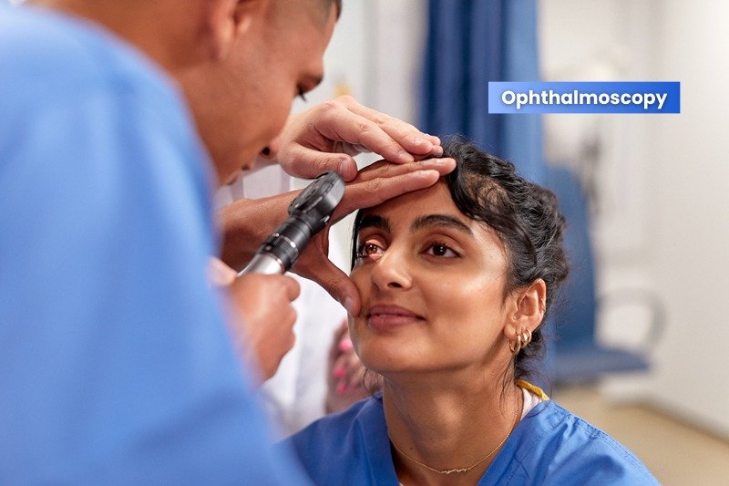 Examines the optic nerve head through a dilated pupil. Reveals signs of glaucoma damage like cupping, thinning, or abnormal coloration.