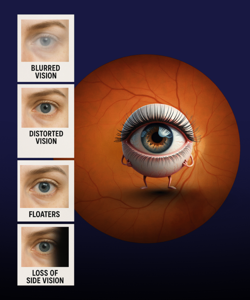 Blurred vision, sudden floaters, light flashes, dark spots, or loss of peripheral vision may signal retinal issues. Immediate treatment can prevent permanent damage.