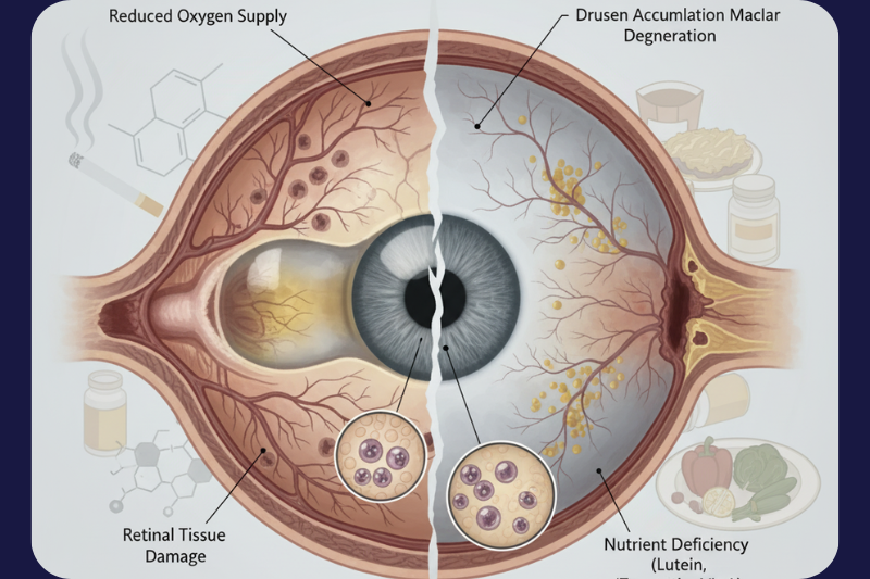 Smoking reduces oxygen supply to retinal tissues, while lack of nutrients like lutein, zeaxanthin, and vitamin A weakens retinal health and increases risk of degeneration.